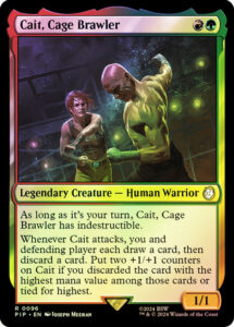 Oracle TextDuring your turn, Cait has indestructible. Whenever Cait attacks, you and defending player each draw a card, then discard a card. Put two +1/+1 counters on Cait if you discarded the card with the greatest mana value among those cards or tied for greatest.