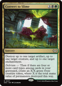 Delirium — Then if there are four or more card types among cards in your graveyard, create an X/X green Ooze creature token, where X is the total mana value of permanents destroyed this way.