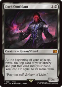Inicio Magic Dark Confidant Dark Confidant₡3 000 Mythic Rare Mana Cost Card TypeCreature Human Wizard Oracle TextAt the beginning of your upkeep, reveal the top card of your library and put that card into your hand. You lose life equal to its mana value. Flavor Text”Fare you well, Bringer of Light.” ArtistImmanuela Crovius Agregar al carrito:Copias 4 Dark Confidant cantidad Añadir al carrito Categoría: Magic Descripción Información adicional Mana Cost 3 Magic Tipo de Carta Creatura – Humano Hechicero Magic Set Final Fantasy Color Black Productos relacionados Inkwell Leviathan Conflux ₡400 Copias 2 Añadir al carrito Arcanis the Omnipotent Dominaria Remastered 039/267 ₡500 Copias 1 Añadir al carrito Aethertide Whale Aether Revolt 027/184 ₡250 Copias 1 Añadir al carrito Abomination of Llanowar Commander Legends 265 ₡150 Copias 1 Añadir al carrito Awakened Awareness Kamigawa: Neon Dynasty 047 ₡150 Copias 1 Añadir al carrito