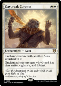 Enchanted creature gets +3/+3 and has first strike, vigilance, and lifelink. (Damage dealt by the creature also causes its controller to gain that much life.)