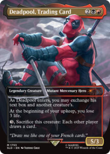 Inicio Magic Deadpool, Trading Card Deadpool, Trading Card₡12 000 Promo Mana Cost Card TypeLegendary Creature Mutant Mercenary Hero Oracle TextAs Deadpool enters, you may exchange his text box and another creature’s. At the beginning of your upkeep, you lose 3 life. , Sacrifice this creature: Each other player draws a card. Flavor Text”Draw me like one of your French cards.” ArtistJustine Cruz Agregar al carrito:Copias 1 Deadpool, Trading Card cantidad Añadir al carrito Categoría: Magic Descripción Información adicional Art Boardless Color Black, Red Foil Non Foil Magic Tipo de Carta Legendary Creature Mutant Mercenary Hero Mana Cost 4 Product Magic The Gathering Rarity Promo Productos relacionados Renewed Faith ₡200 Copias 1 Añadir al carrito Gruff Triplets ₡400 Copias 1 Añadir al carrito Genesis ₡400 Copias 1 Añadir al carrito Dungeon Delver ₡250 Copias 1 Añadir al carrito Compulsion ₡250 Copias 1 Añadir al carrito