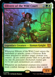 Oracle TextWhenever Ellivere of the Wild Court enters or attacks, create a Virtuous Role token attached to another target creature you control. (If you control another Role on it, put that one into the graveyard. Enchanted creature gets +1/+1 for each