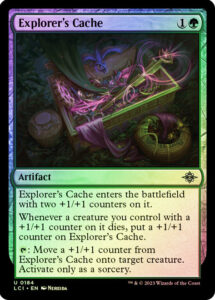 : Move a +1/+1 counter from Explorer’s Cache onto target creature. Activate only as