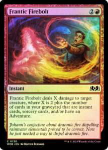 Oracle TextFrantic Firebolt deals X damage to target creature, where X is 2 plus the number of cards in your graveyard that are instant cards, sorcery cards, and/or have an Adventure.