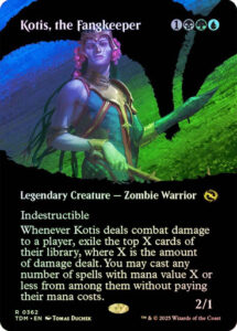 Whenever Kotis deals combat damage to a player, exile the top X cards of their library, where X is the amount of damage dealt. You may cast any number of spells with mana value X or less from among them without paying their mana costs.
