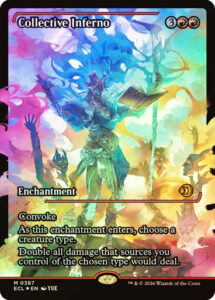 Oracle TextConvoke (Your creatures can help cast this spell. Each creature you tap while casting this spell pays for or one mana of that creature’s color.) As this enchantment enters, choose a creature type. Double all damage that sources you control of the chosen type would deal.