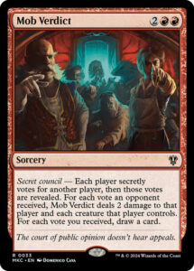 Oracle TextSecret council — Each player secretly votes for another player, then those votes are revealed. For each vote an opponent received, Mob Verdict deals 2 damage to that player and each creature that player controls. For each vote you received, draw a