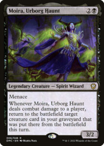 Whenever Moira deals combat damage to a player, return to the battlefield target creature card in your graveyard that was put there from the battlefield this turn.