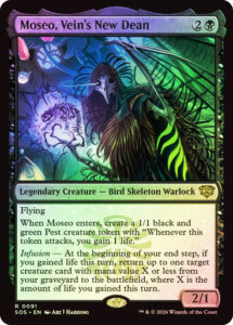 Oracle TextFlying When Moseo enters, create a 1/1 black and green Pest creature token with “Whenever this token attacks, you gain 1 life.” Infusion — At the beginning of your end step, if you gained life this turn, return up to one target creature card with mana value X or less from your graveyard to the battlefield, where X is the amount of life you gained this turn.