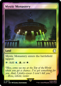 Inicio Magic Mystic Monastery Mystic Monastery₡1 000 Uncommon Card TypeLand Oracle TextThis land enters tapped. : Add , , or . Flavor Text”Hey, come see me at the Top of the World when you get a chance. I’ve got something for you. And, I pinky-swear I won’t kill you.” —Rose, robotic raider ArtistKamila Szutenberg Agregar al carrito:Copias 1 Mystic Monastery cantidad Añadir al carrito Categoría: Magic Descripción Información adicional Art Normal Color Non – Color Foil Foil Magic Set Fallout Commander Magic Tipo de Carta Land Product Magic The Gathering Productos relacionados Hundred-Handed One ₡250 Copias 1 Añadir al carrito Agent of the Shadow Thieves ₡400 Copias 1 Añadir al carrito Ian the Reckless ₡400 Copias 1 Añadir al carrito Firja, Judge of Valor ₡250 Copias 1 Añadir al carrito Compulsion ₡250 Copias 1 Añadir al carrito