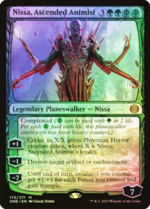+1: Create an X/X green Phyrexian Horror creature token, where X is Nissa’s loyalty.
