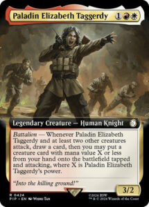 Oracle TextBattalion — Whenever Paladin Elizabeth Taggerdy and at least two other creatures attack, draw a card, then you may put a creature card with mana value X or less from your hand onto the battlefield tapped and attacking, where X is Paladin Elizabeth Taggerdy’s power.