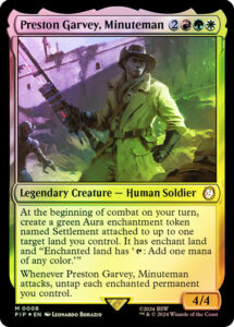 Oracle TextAt the beginning of combat on your turn, create a green Aura enchantment token named Settlement attached to up to one target land you control. It has enchant land and “Enchanted land has ‘: Add one mana of any color.'”