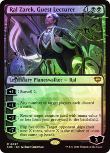 Oracle Text+1: Surveil 2. −1: Any number of target players each discard a card. −2: Return target creature card with mana value 3 or less from your graveyard to the battlefield. −7: Flip five coins. Target opponent skips their next X turns, where X is the number of coins that came up heads.