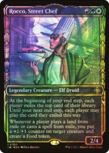Oracle TextAt the beginning of your end step, each player exiles the top card of their library. Until your next end step, each player may play the card they exiled this way. Whenever a player plays a land from exile or casts a spell from exile, you put a +1/+1 counter on target creature and create a Food token. (It’s an artifact with “, , Sacrifice this token: You gain 3 life.”)