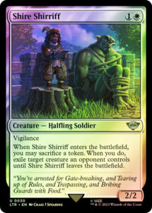 When Shire Shirriff enters, you may sacrifice a token. When you do, exile target creature an opponent controls until Shire Shirriff leaves the battlefield.
