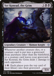 Oracle TextWhenever another creature dies, or a creature card is put into a graveyard from anywhere other than the battlefield, or a creature card leaves your graveyard, Syr Konrad deals 1 damage to each opponent.