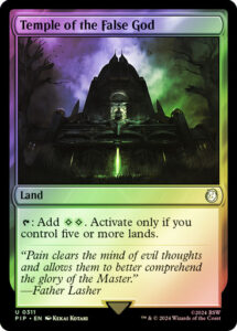 Inicio Magic Temple of the False God Temple of the False God₡1 500 Uncommon Card TypeLand Oracle Text: Add . Activate only if you control five or more lands. Flavor Text”Pain clears the mind of evil thoughts and allows them to better comprehend the glory of the Master.” —Father Lasher ArtistKekai Kotaki Agregar al carrito:Copias 1 Temple of the False God cantidad Añadir al carrito Categoría: Magic Descripción Información adicional Art Normal Foil Foil Magic Set Fallout Commander Color Multicolor Magic Tipo de Carta Land Product Magic The Gathering Rarity Uncommon Productos relacionados Dragon Mantle ₡250 Copias 1 Añadir al carrito Agent of the Shadow Thieves ₡400 Copias 1 Añadir al carrito Hundred-Handed One ₡250 Copias 1 Añadir al carrito Gruff Triplets ₡400 Copias 1 Añadir al carrito High Alert Ravnica Allegiance ₡250 Copias 1 Añadir al carrito