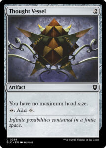 Inicio Magic Thought Vessel Bloomburrow Commander Thought Vessel Bloomburrow Commander₡1 250 Card NameThought Vessel SetBloomburrow Commander Mana Cost Card TypeArtifact Oracle TextYou have no maximum hand size. : Add . Flavor TextInfinite possibilities contained in a finite space. Artistrk post Collector Number289 RarityCommon FinishNon-foil Agregar al carrito:Copias 1 Thought Vessel Bloomburrow Commander cantidad Añadir al carrito Categoría: Magic Descripción Productos relacionados Caparocti Sunborn ₡250 Copias 1 Añadir al carrito Agent of the Shadow Thieves ₡400 Copias 1 Añadir al carrito Haphazard Bombardment ₡250 Copias 1 Añadir al carrito Gruff Triplets ₡400 Copias 1 Añadir al carrito Momentary Blink ₡500 Copias 1 Añadir al carrito